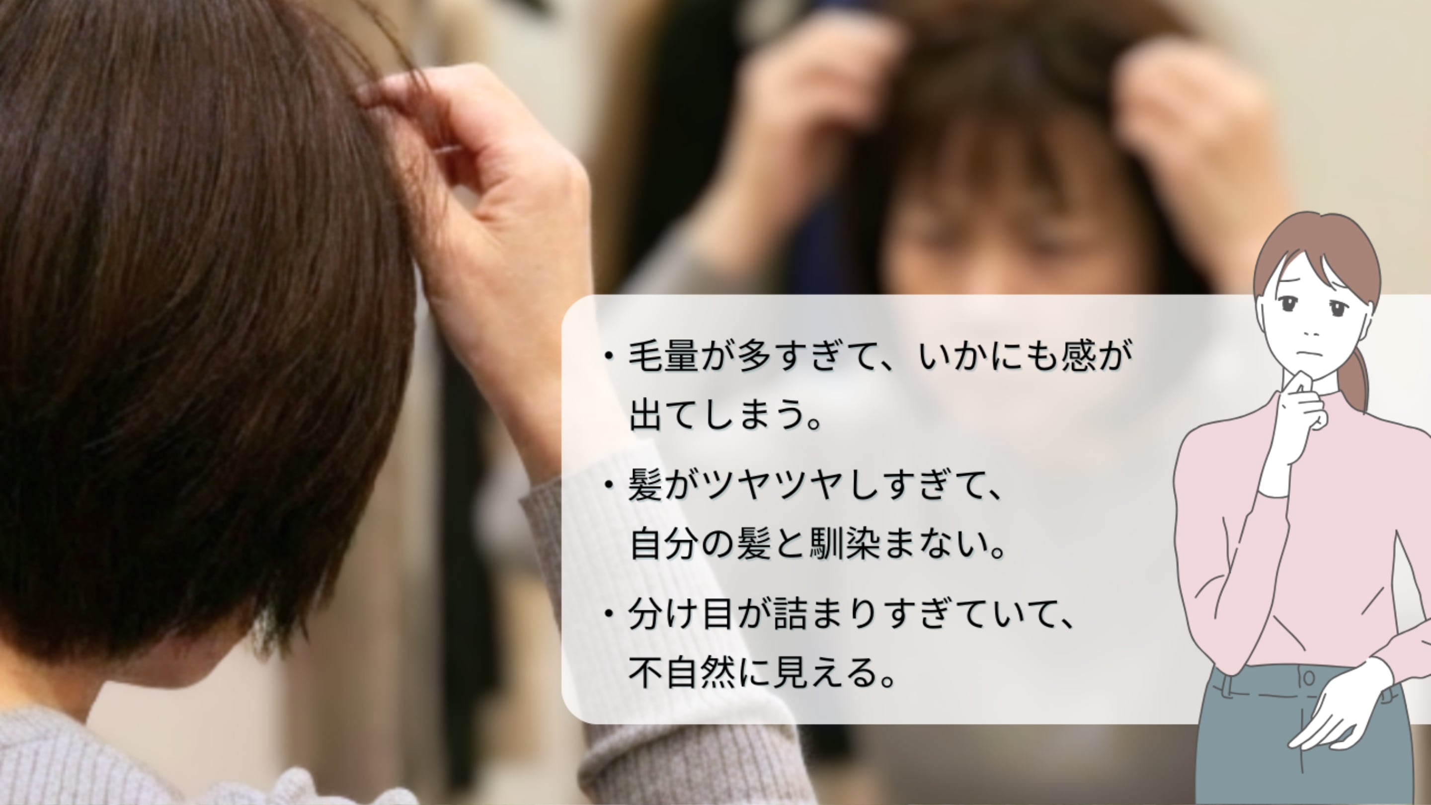 ウィッグの多くは、誰にでも合うように毛量が多く作られています。そのため、大人女性には合わせづらく「ウィッグ感」が出てしまうのです。