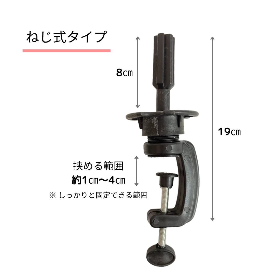 「ウィッグ固定用クランプ(ネジ式タイプ)」は、テーブルや作業台にしっかりと取り付けできる、ウィッグスタンド専用のクランプ器具です。