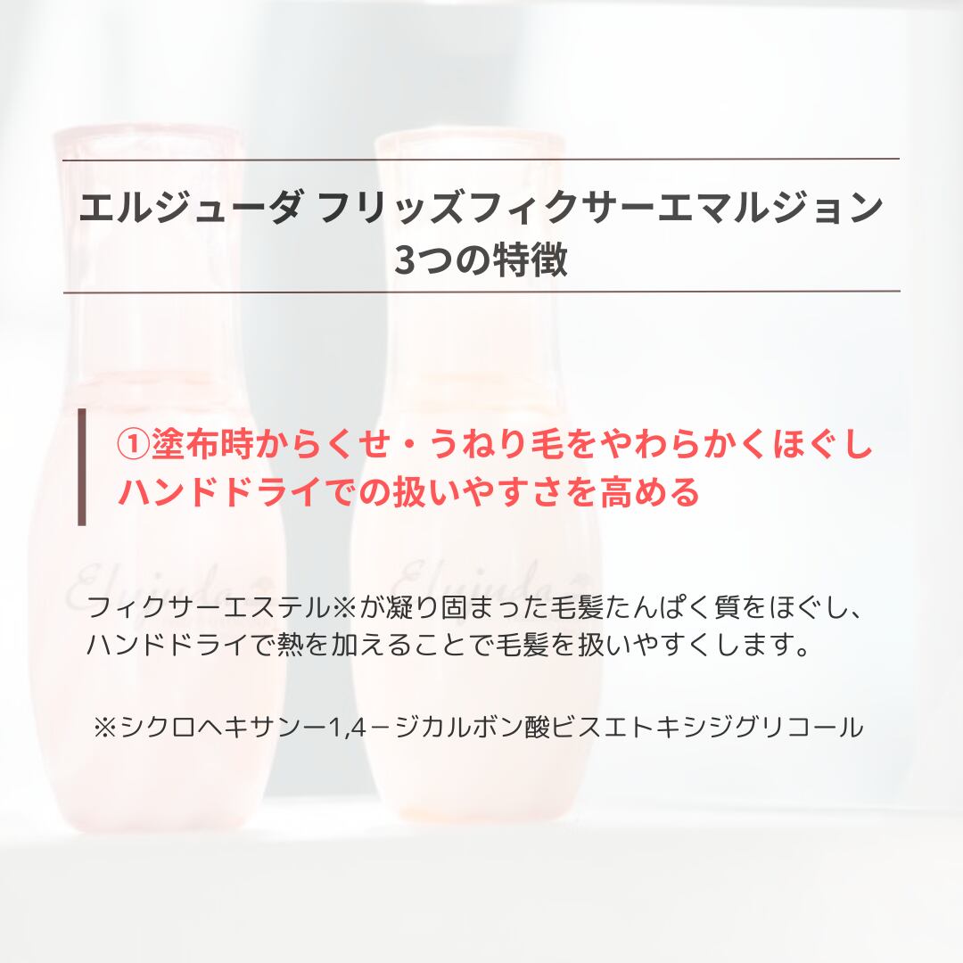 「ミルボン エルジューダ フリッズフィクサー エマルジョン+」は、**水分保持力が低下した髪を、芯からうるおわせて整えるアウトバストリートメント(洗い流さないミルク)**です。