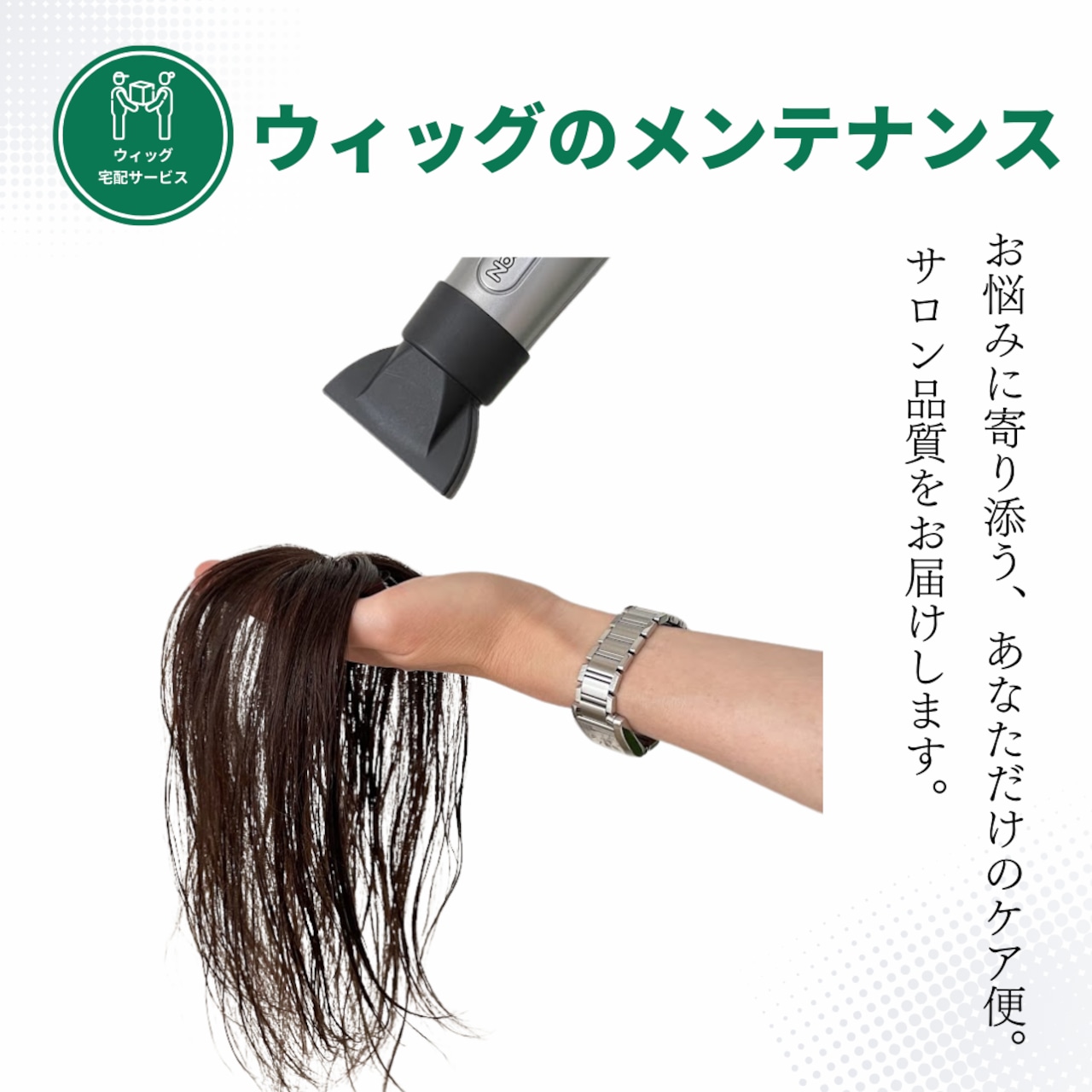 「フラッティスの宅配ウィッグケア便|ウィッグメンテナンス」は、ウィッグ専門美容師が、洗浄・トリートメント・ブロー仕上げまでを丁寧に行う宅配型のメンテナンスサービスです。