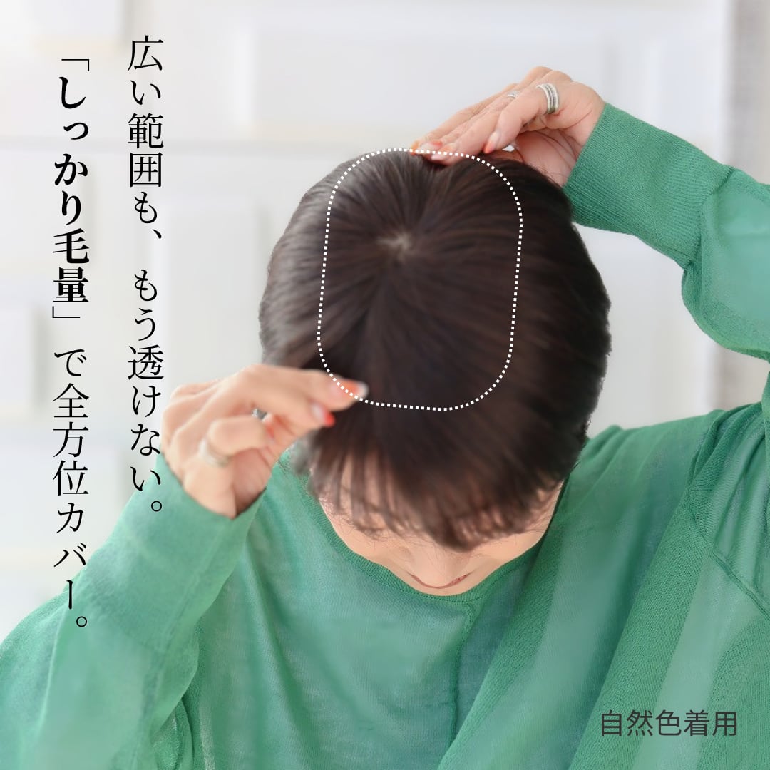 分け目やつむじのピンポイントな悩みだけでなく、頭頂部全体のボリューム不足や広がる白髪を、これ一つでまるごとカバー。ベース面積が広いため、風が吹いても地肌が見えにくく、安心してお出かけを楽しめます。