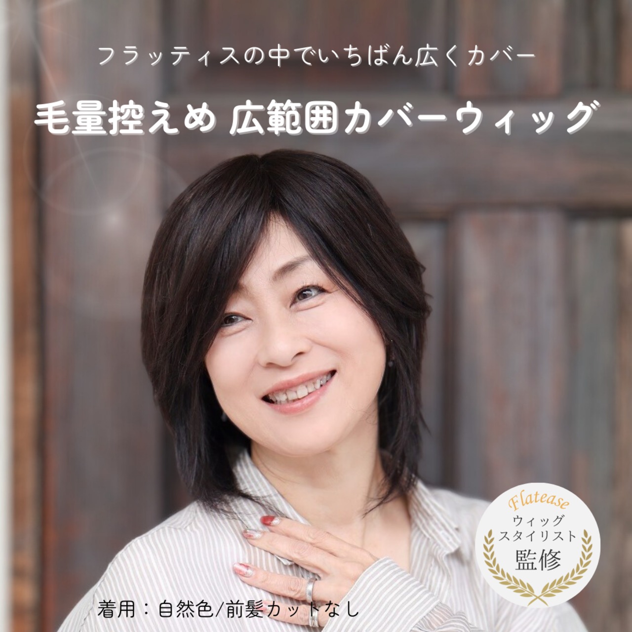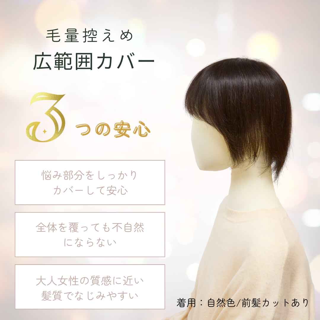 このウィッグは、つむじや頭頂部の広範囲をカバーする“広めサイズ”で、気になる部分をしっかり守りつつ、毛量を控えめに設計されています。