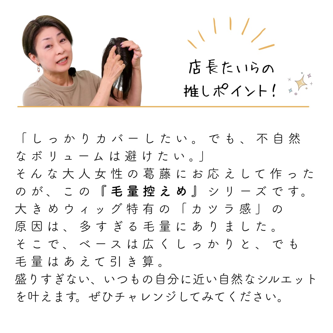 すっぽりと広範囲を覆える安心のビッグサイズでありながら、あえて毛量をグッと抑えることで「のせている感」を払拭。自毛にスッと溶け込み、まるでご自身の髪のように軽やかで自然なシルエットを実現します。