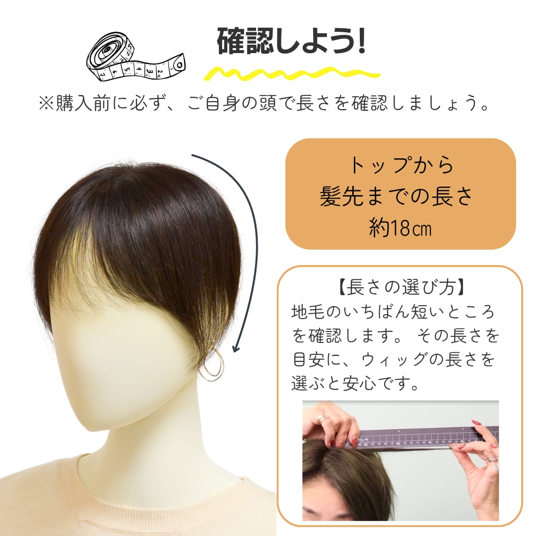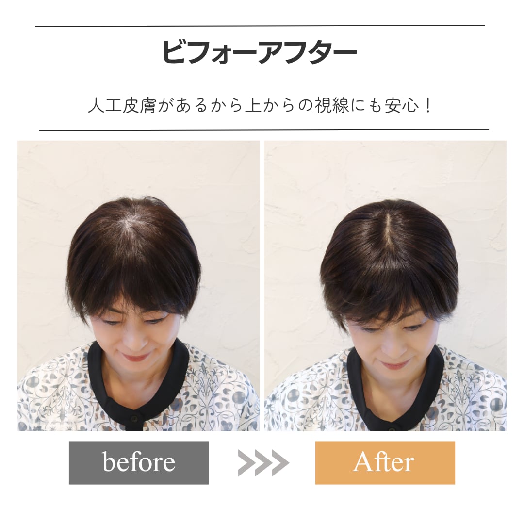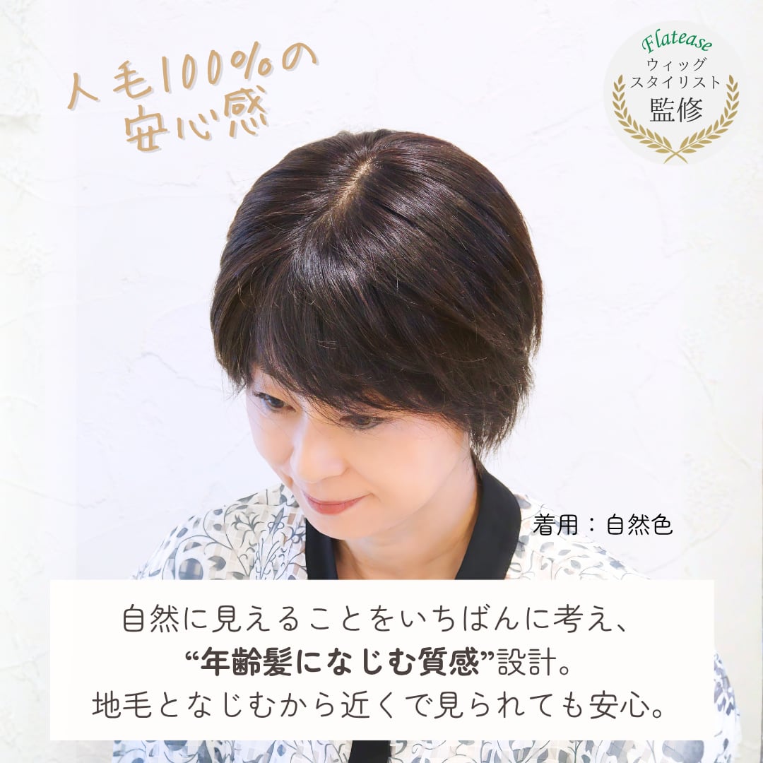 前髪から、つむじ、後頭部にかけての広範囲をしっかり覆い隠せるビッグサイズのベース(12×16cm)を採用。風が吹いても自毛との境目が見えにくく、どこから見られても安心のカバー力です。