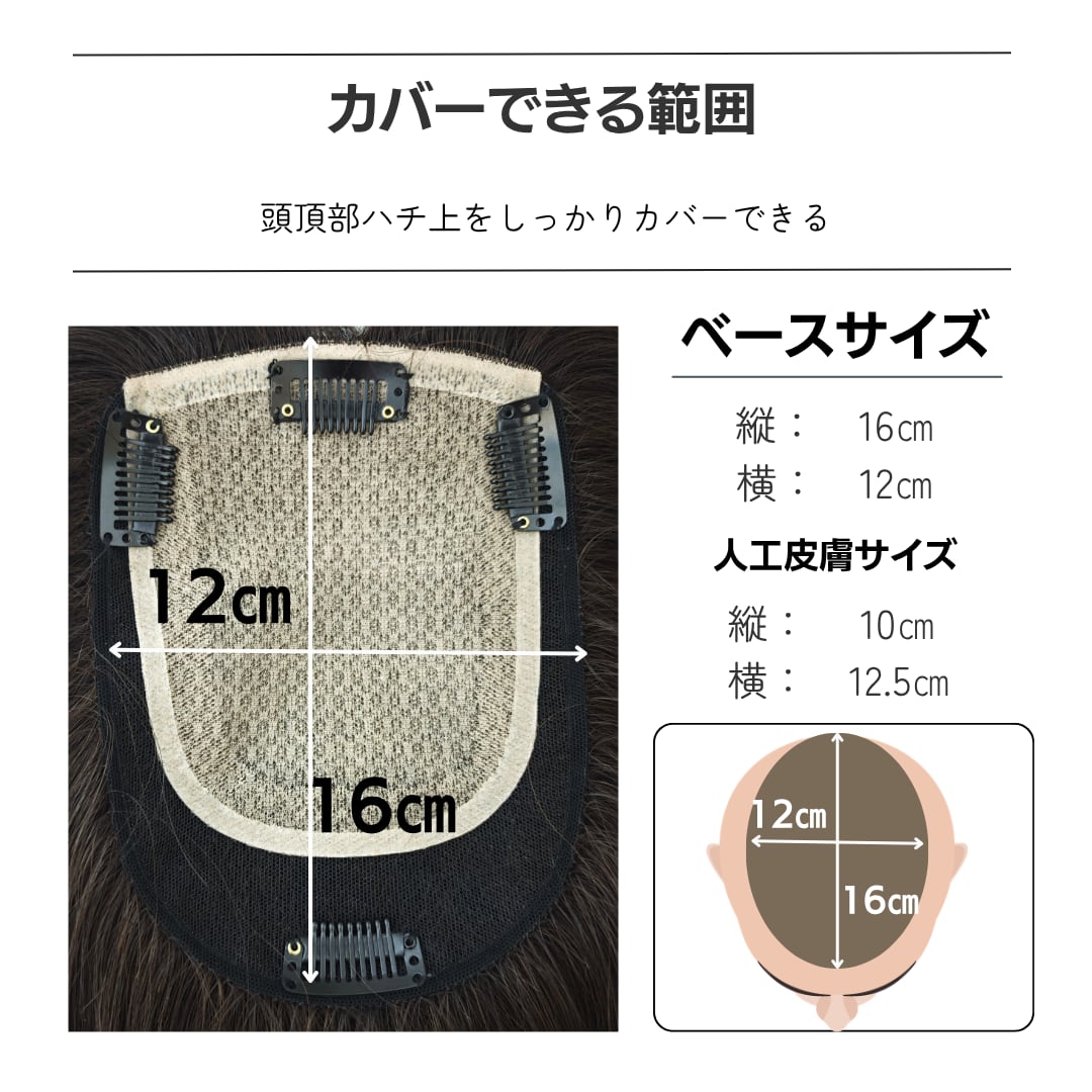 人毛100% 毛量控えめ 広範囲カバーウィッグ ショート用 (大きめ12×16cm) 部分ウィッグ 自然な薄毛・白髪隠し ヘアピース