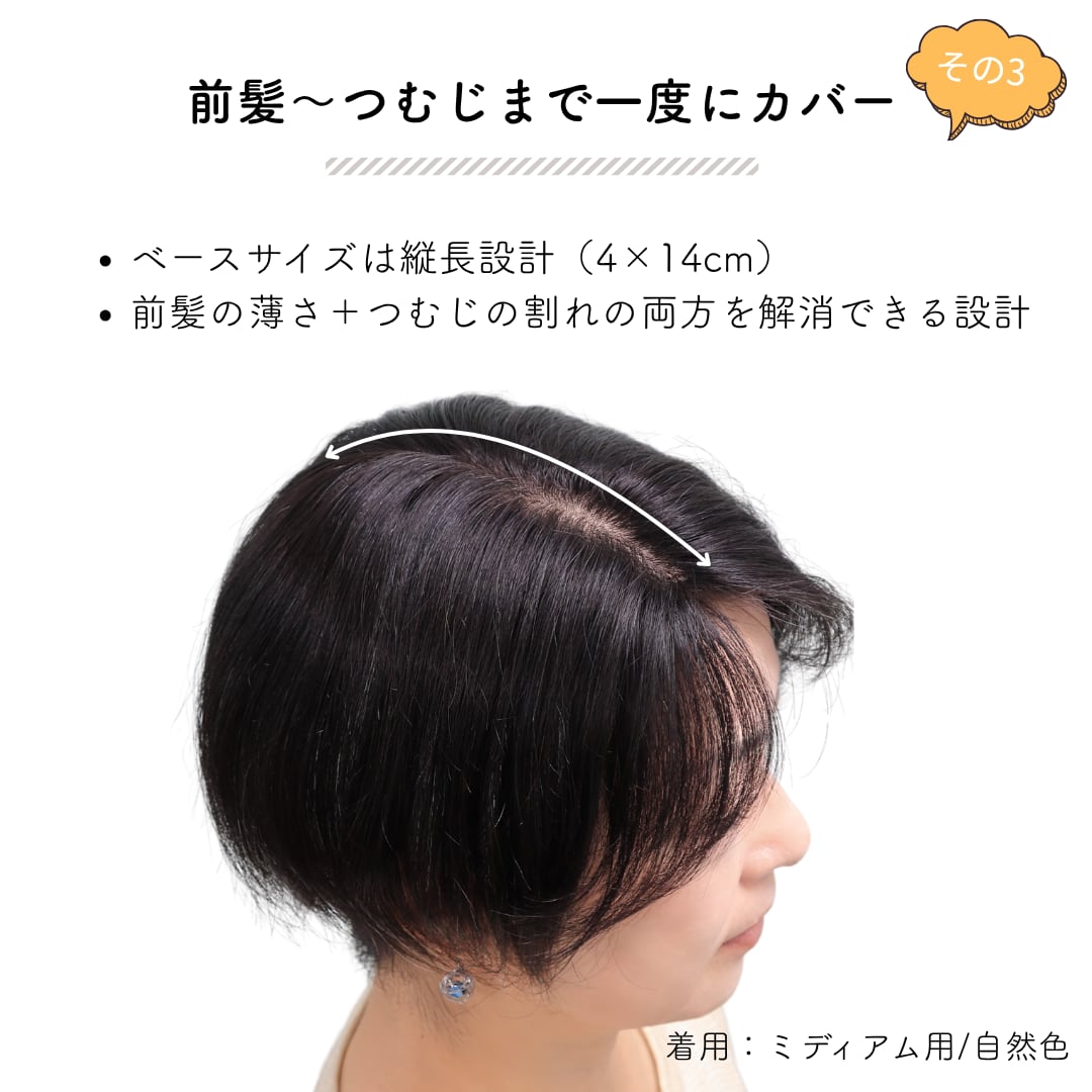 あえて【4×14cmの細長ベース】を採用することで、年齢に合わせた自然な毛量を実現。