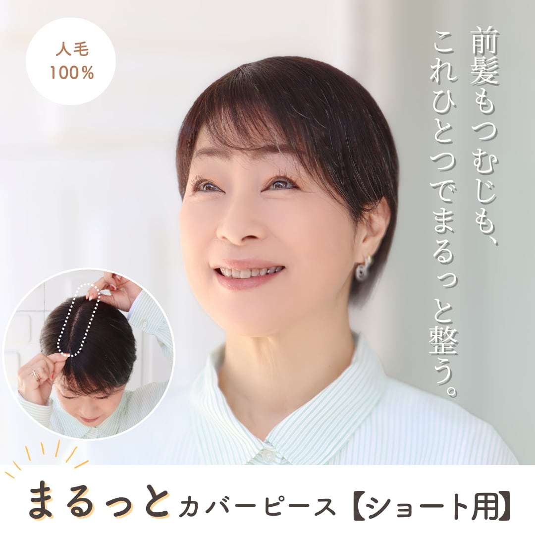人毛100% まるっとカバーピース ショート用 部分ウィッグ 前髪・分け目・つむじ割れ同時カバー 美容師カット 盛りすぎない自然な毛量 4×14cm