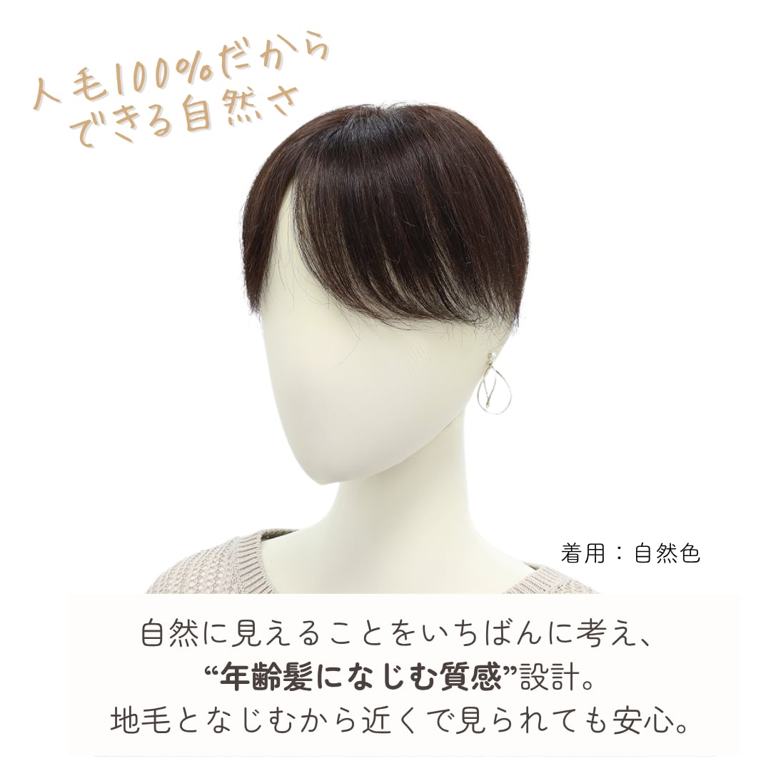 地毛の毛流れや段差に自然に繋がるよう、あらかじめ計算されたカットを施しています。毛量が控えめな分、自毛との境界線がより一層わかりにくく、ブラシでサッと整えるだけでスタイリングが完了します。