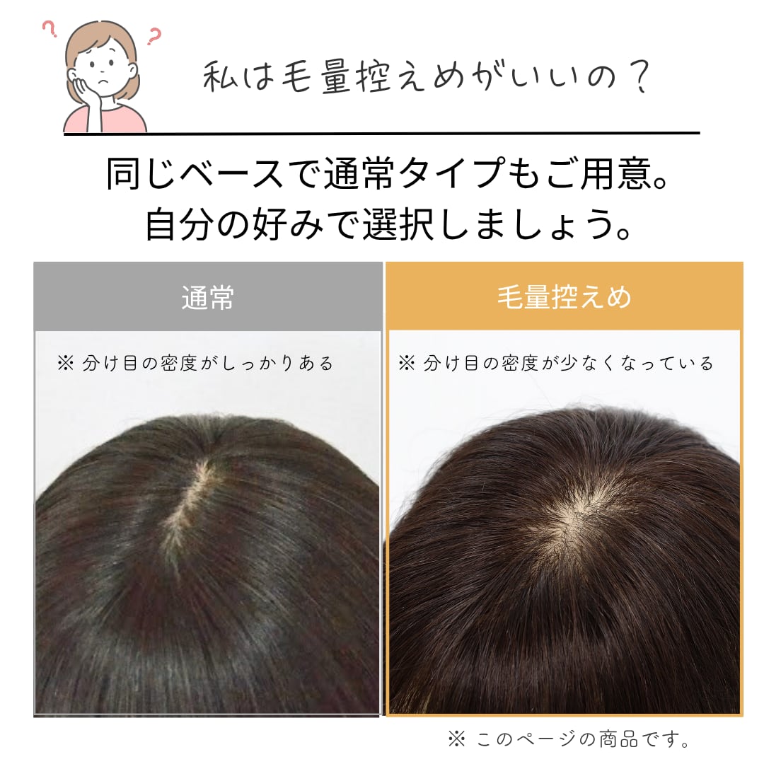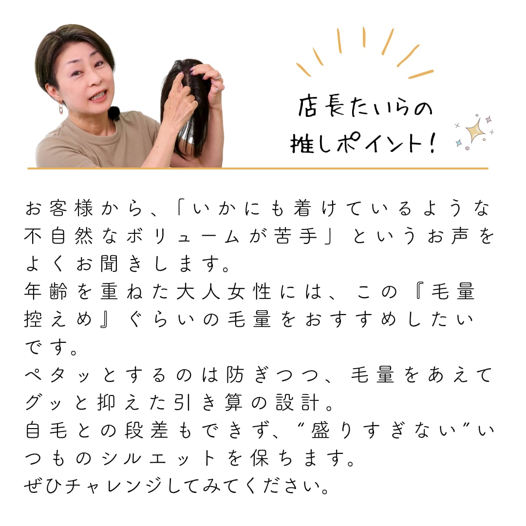 分け目をすっぽり覆える安心の長方形ベースはそのままに、あえて毛量をグッと抑えることで「のせている感」をゼロに。