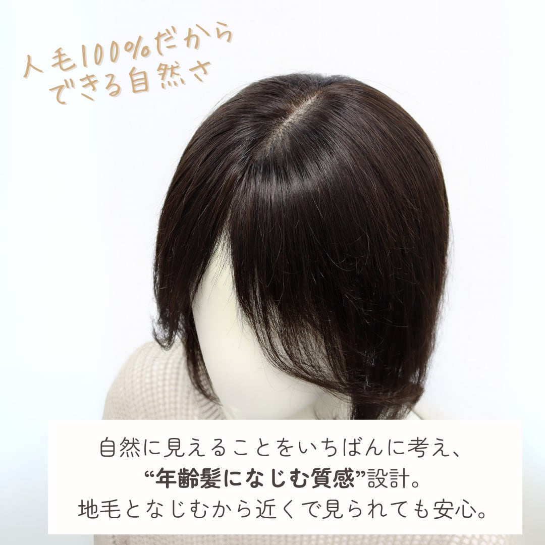 分け目をすっぽり覆える安心の長方形ベースはそのままに、あえて毛量をグッと抑えることで「のせている感」をゼロに。