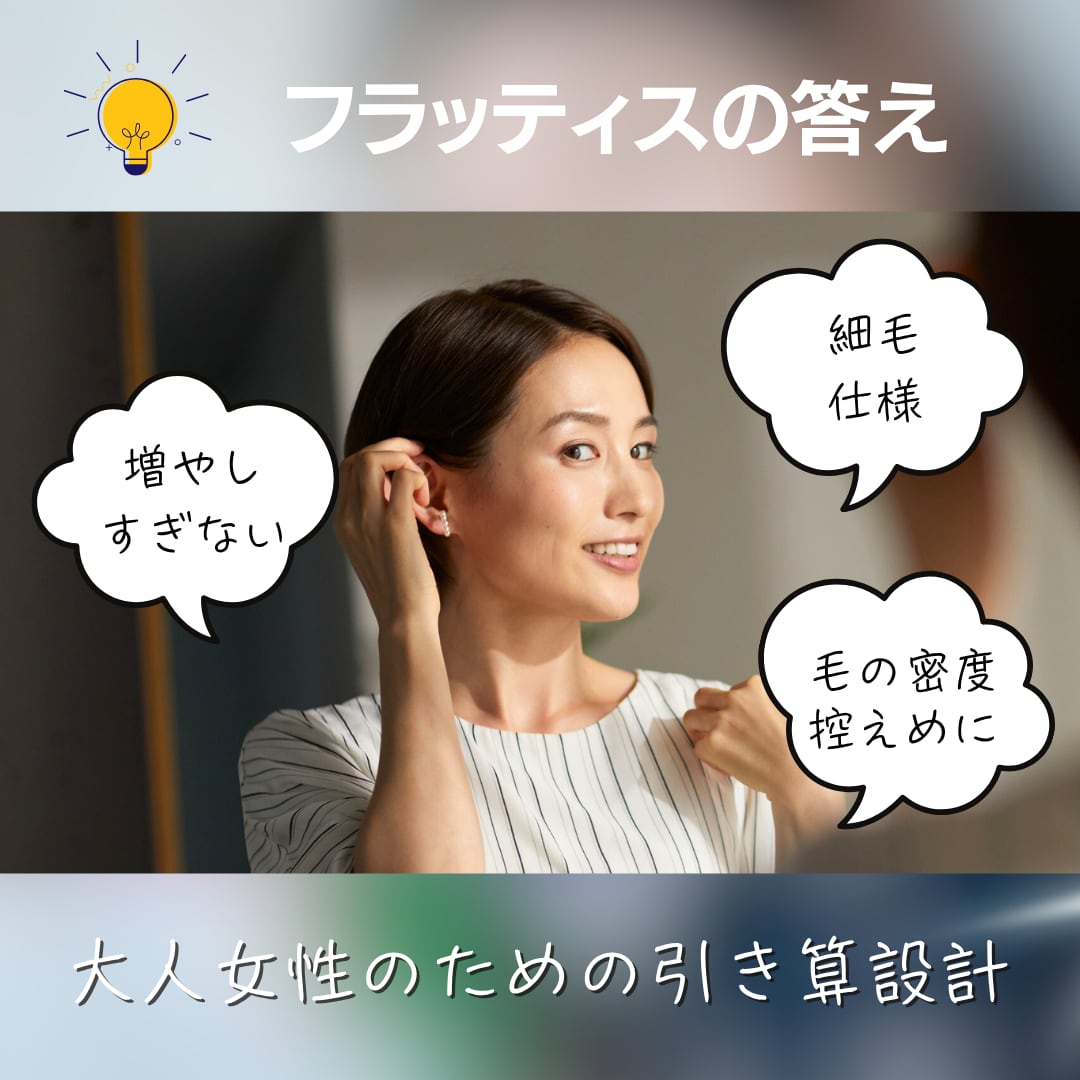 「ウィッグを着けると頭が大きく見える」「毛量が多くて家族にバレそう」という不安を解消するため、必要最低限の毛量に調整したこだわりの「引き算」設計。