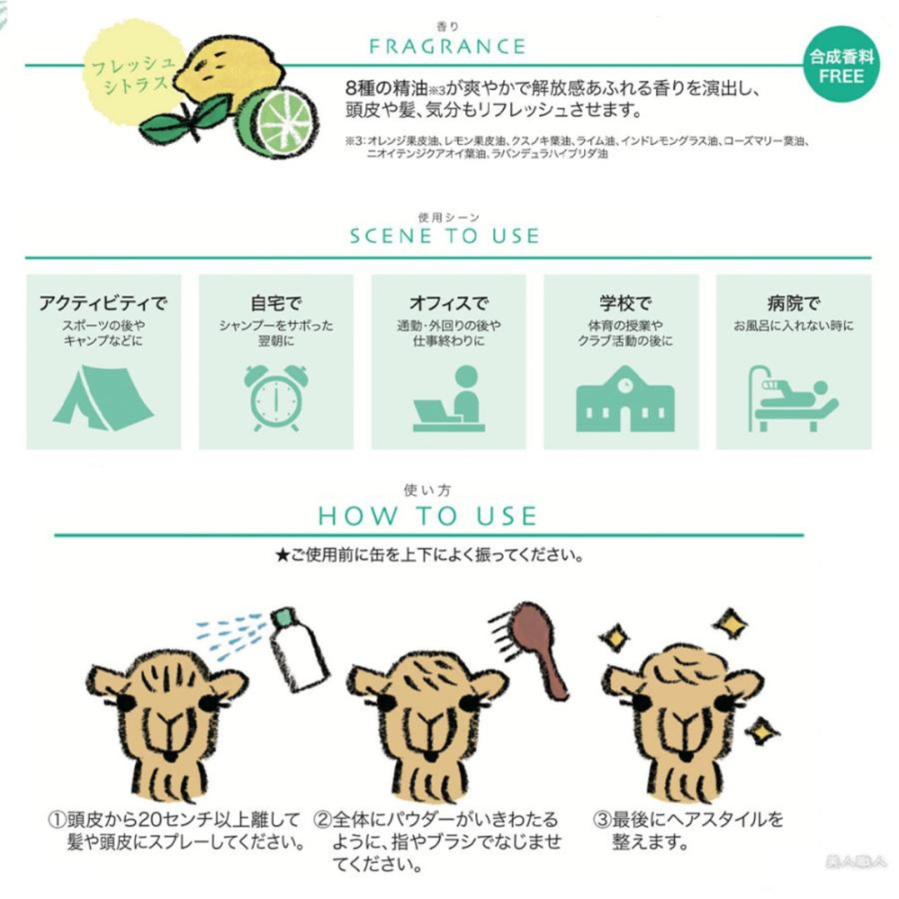 ふたつの植物由来パウダーが汗や皮脂を吸着し、頭皮や髪のベタつきを抑え、サラサラな状態へ。 また4種のボタニカル成分配合で頭皮や髪にたっぷりと潤いを与えて、乾燥を防ぎます。