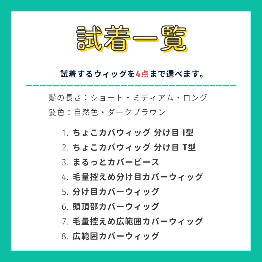 お送りする試着ウィッグは、日程調整のメールにてご希望をお伺いします。